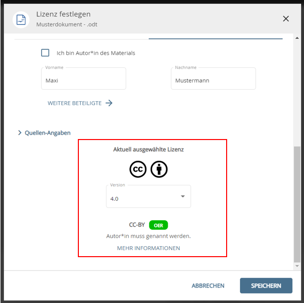 Nachdem Sie Ihre Lizenzangabe gespeichert haben, wird sie in der Beschreibung Ihrer Materialien sichtbar. Weitere Informationen zu den Creative Commons LizenzenLizenzen geben Informationen über rechtliche Aspekte, Urheb More finden Sie im ZOERRDas Zentrale Open Educational Resources Repositorium (ZOERR) More in der FAQ Lizenz.